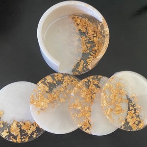 White and Gold Leaf Resin Coasters with Holder. Set of 4 Round Coasters.