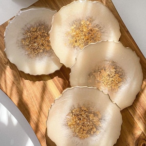 Pressed Flower Resin Coaster Set: Gold and White Minimalist Decor